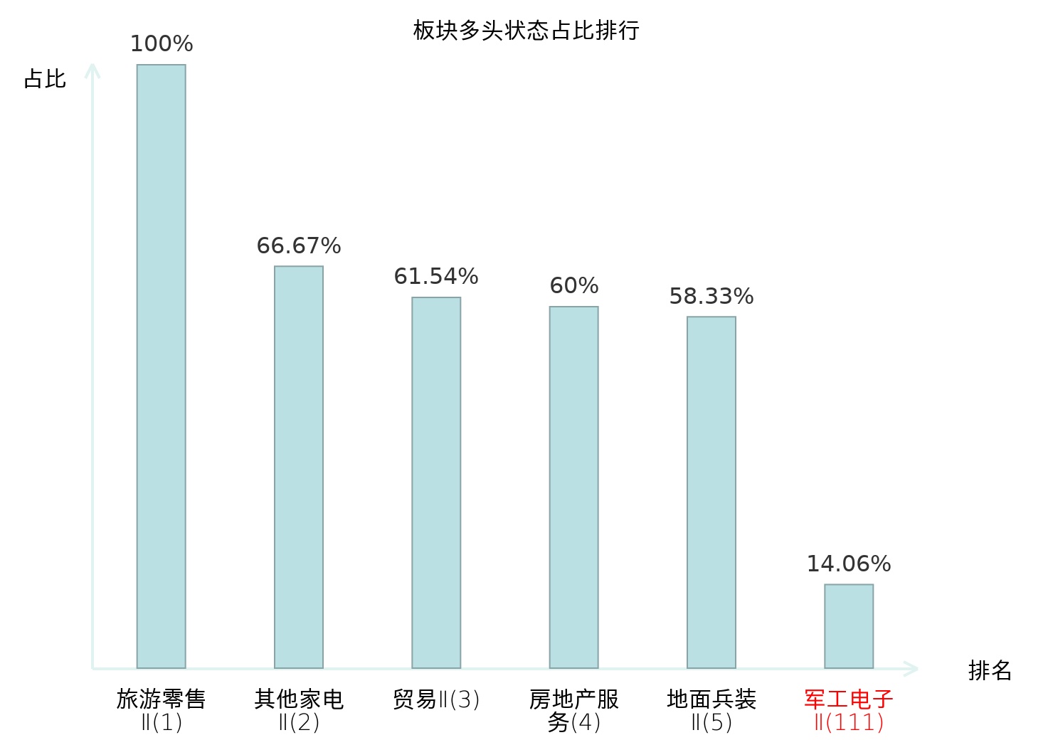 全市场所有行业板块中主力多头状态占比排名中,旅游零售Ⅱ板块位居第一。化妆品板块名次提升最快,较昨日上升62位。