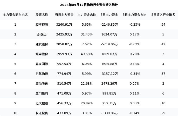从主力资金流向来看,物流行业今日主力资金流入10.15亿元,在所有申万二级行业中排名:97/131。