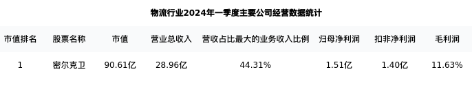 密尔克卫最新报告期数据为一季度,下表汇总了物流行业内市值靠前的公司一季度主要经营数据