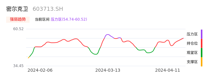 我们来看一下该股的九方特色指标强弱趋势的情况:密尔克卫近日从持仓区进入压力区。股价出现一波快速拉升行情,目前上升动能较为充足可继续持股。注意今日上方压力位:60.52元是否能有效突破。