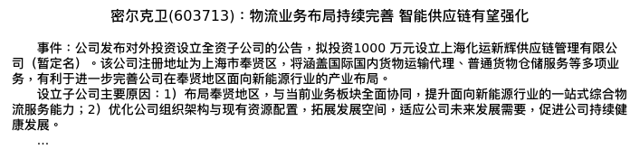 值得注意的是:2024年03月财通证券的于健分析师,首次发布关于密尔克卫的研究报告,标题为:密尔克卫(603713):物流业务布局持续完善 智能供应链有望强化。