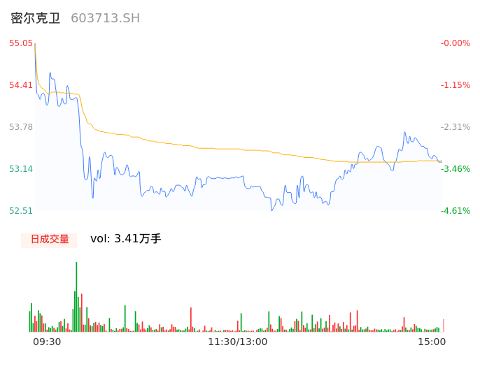 04月23日,密尔克卫收报53.25,股价涨幅-3.27%,成交金额1.82亿元,换手率2.08%。