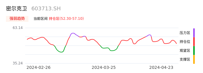 我们来看一下该股的九方特色指标强弱趋势的情况:密尔克卫自04月15日从压力区回到持仓区。股价近期持续调整。后续重点关注能否站稳多空分界点:52.30元。如被有效击穿则将进入空头行情。