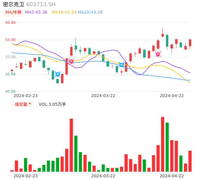 04月22日,密尔克卫收报55.05,股价涨幅3.48%,成交金额1.65亿元,换手率1.86%。
