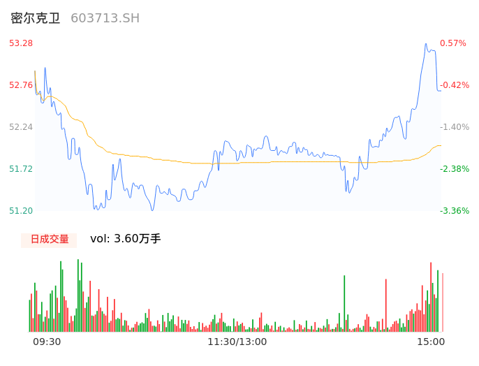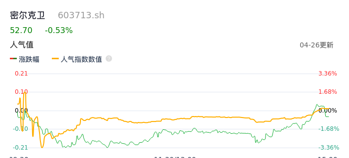 04月26日,密尔克卫收报52.70,股价涨幅-0.53%,成交金额1.87亿元,换手率2.19%。