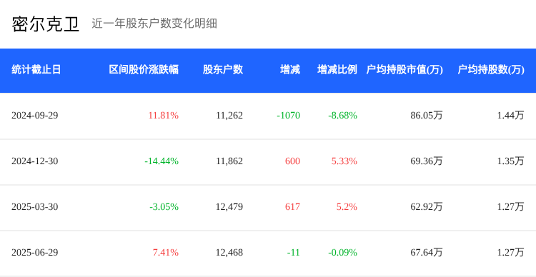 截至2025年6月30日,密尔克卫(603713)的股东户数为1.25万,较上一期减少0.09,户均持股数量环比上升0.09,户均持股市值达到67.64万,环比增长7.51%。期间,该股表现较为稳健,股价涨幅为7.41%,日均成交量为181.04万手,环比增加56.34%,日均换手率为1.14%,环比增长56.16%。