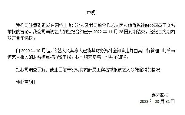 8月31日中午,宋祖儿前经纪公司喜天影视发布声明,称与宋祖儿经纪合约已于2022年11月28日到期。自2020年10月起,宋祖儿及家人已将财务资料全部拿走并自行管理,此后未参与相关财务核算和纳税申报。声明还称,经调查了解,未发现有内部员工实名举报宋祖儿涉嫌偷税的情况。