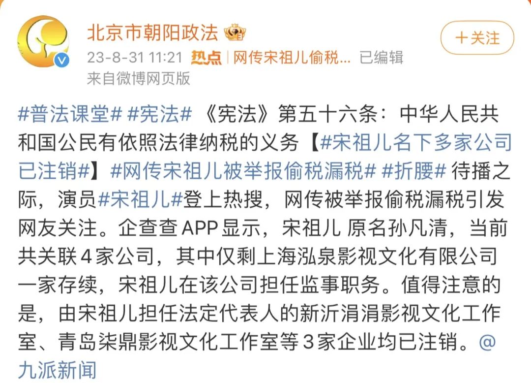 值得注意的是,8月31日中午,“北京市朝阳政法”官微转发宋祖儿的相关消息,并且特别强调,每位公民都有依法纳税的义务。
