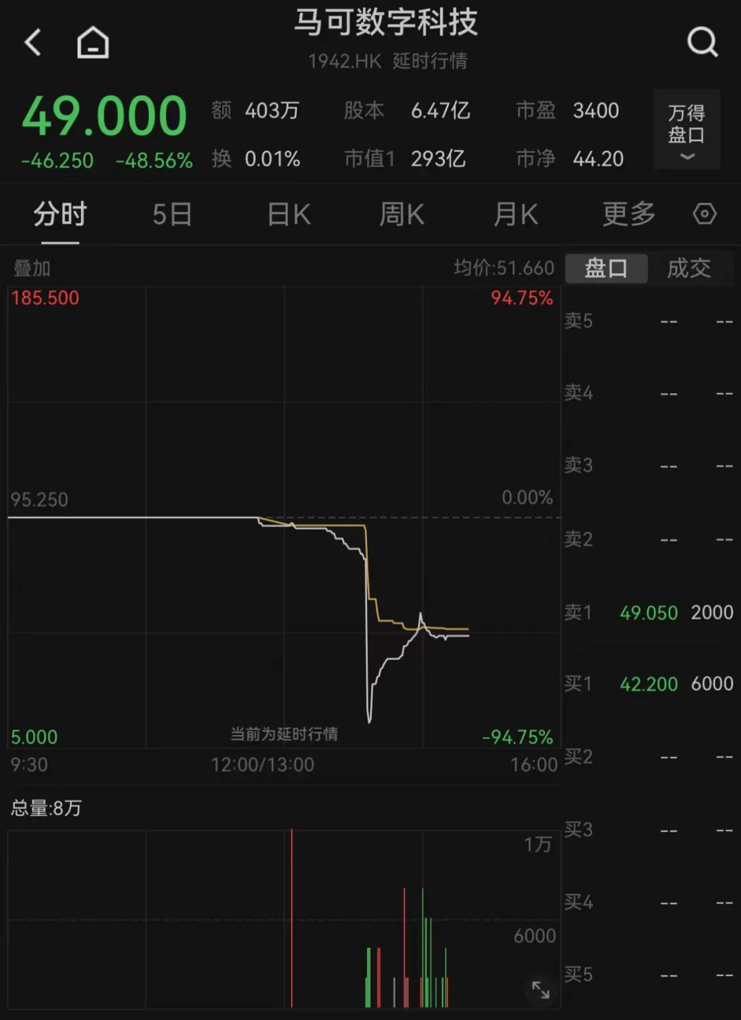 马可数字科技盘中跌超94%