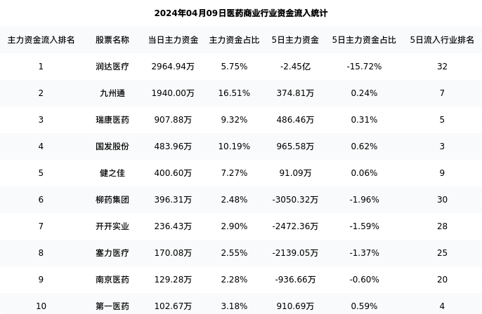 从主力资金流向来看,医药商业行业今日主力资金流入5.39亿元,在所有申万二级行业中排名:96/131。