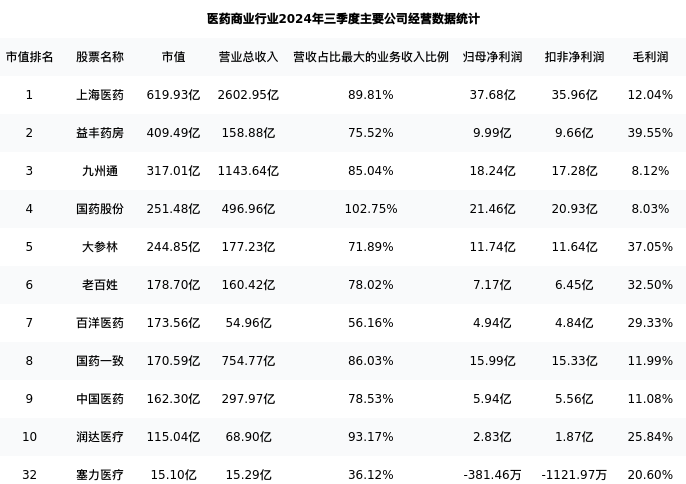 塞力医疗最新报告期数据为三季度,下表汇总了医药商业行业内市值靠前的公司三季度主要经营数据