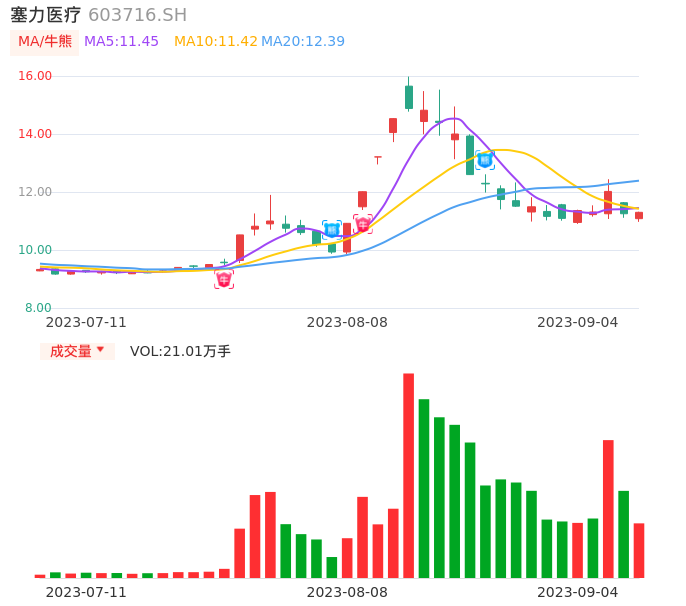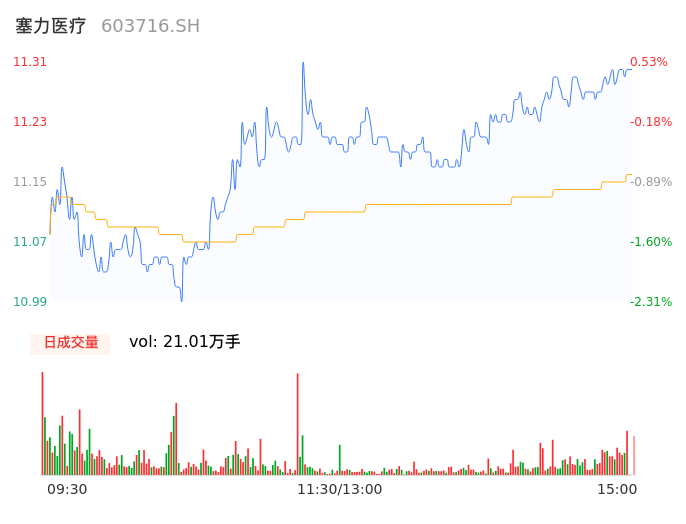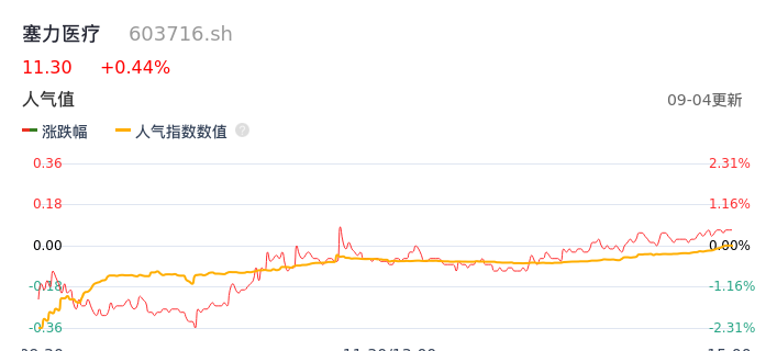 09月04日,塞力医疗收报11.30,股价涨幅0.44%,成交金额2.34亿元,换手率10.44%。