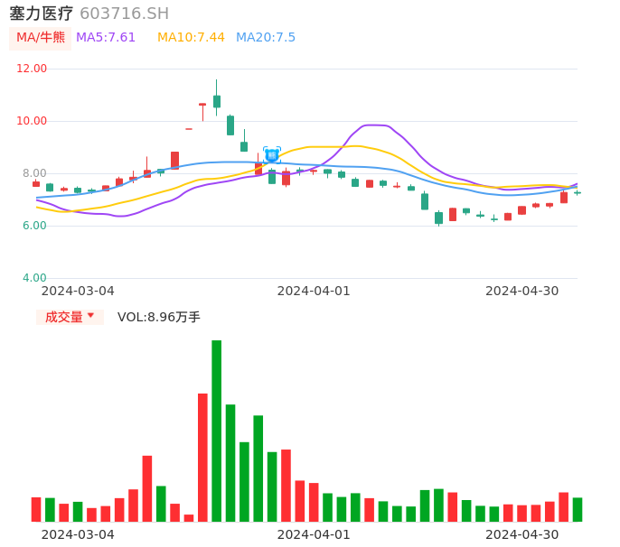04月30日,塞力医疗收报7.24,股价涨幅-0.41%,成交金额6489.13万元,换手率4.45%。
