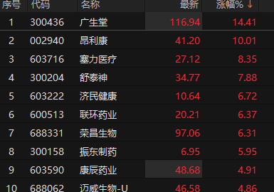 上证报中国证券网讯 10月15日早盘,创新药概念股震荡拉升,截至10时10分,昂利康涨停,广生堂涨超10%,塞力医疗、舒泰神、荣昌生物、联环药业等跟涨。