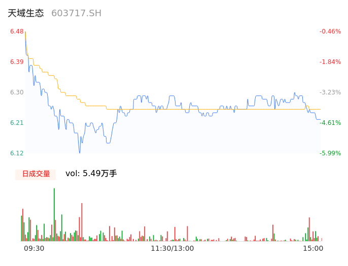 04月10日,天域生态收报6.23,股价涨幅-4.30%,成交金额3433.86万元,换手率1.89%。