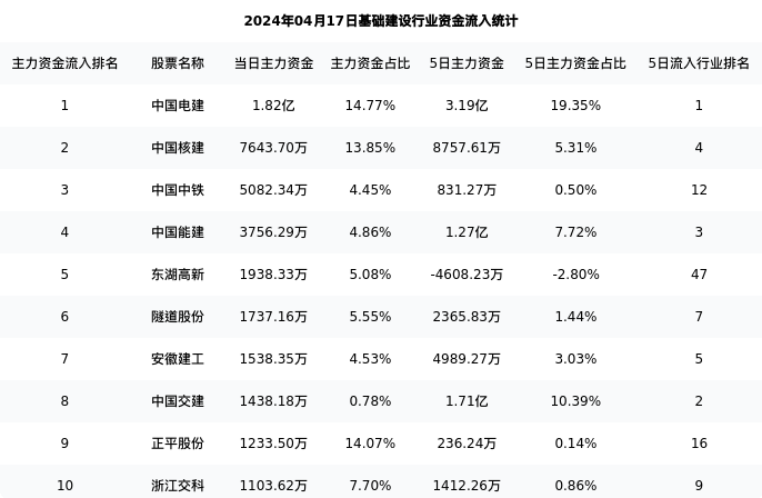 从主力资金流向来看,基础建设行业今日主力资金流入41.53亿元,在所有申万二级行业中排名:61/131。