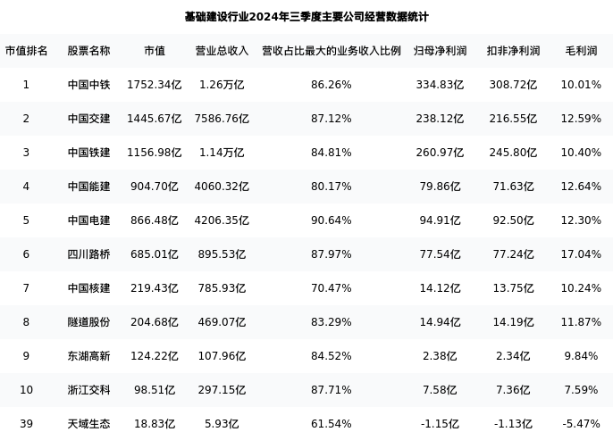 天域生态最新报告期数据为三季度,下表汇总了基础建设行业内市值靠前的公司三季度主要经营数据