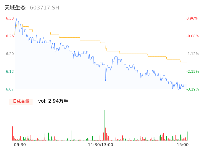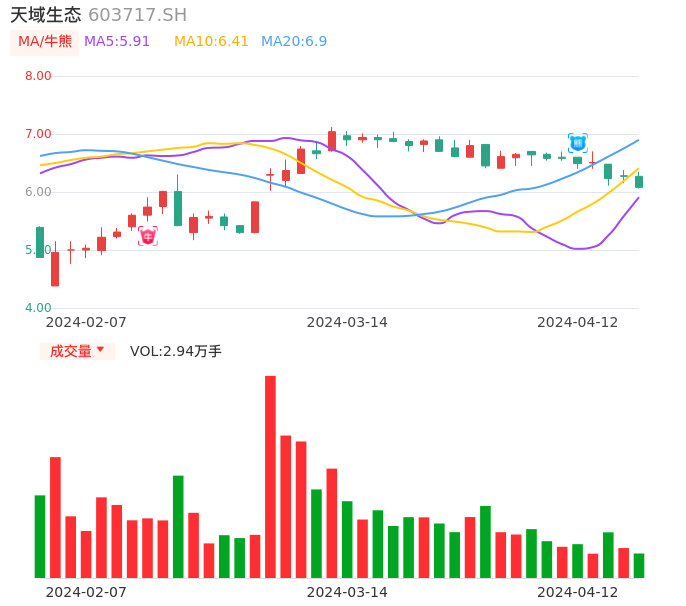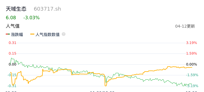 04月12日,天域生态收报6.08,股价涨幅-3.03%,成交金额1814.44万元,换手率1.01%。