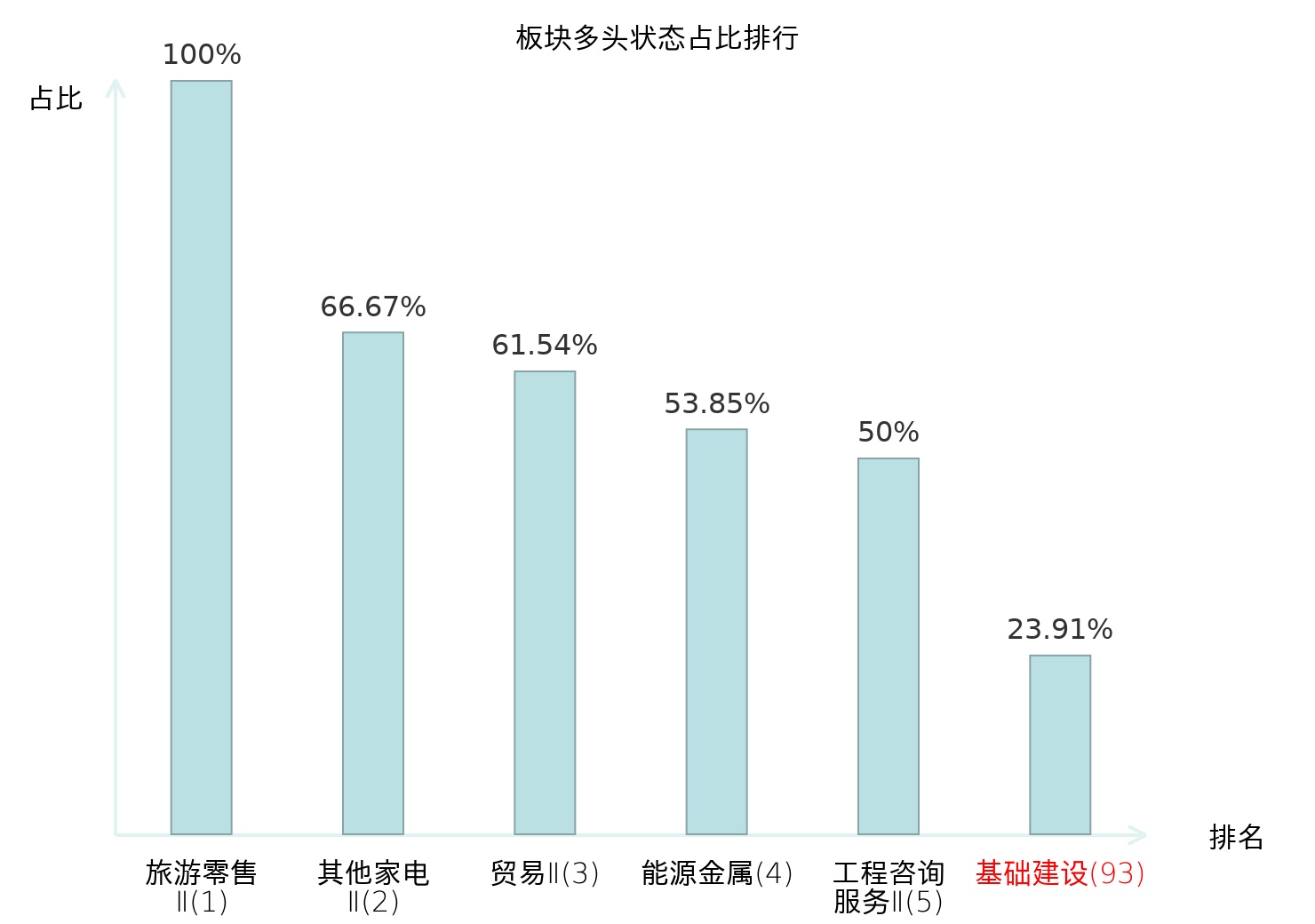 全市场所有行业板块中主力多头状态占比排名中,旅游零售Ⅱ板块位居第一。冶钢原料板块名次提升最快,较昨日上升37位。