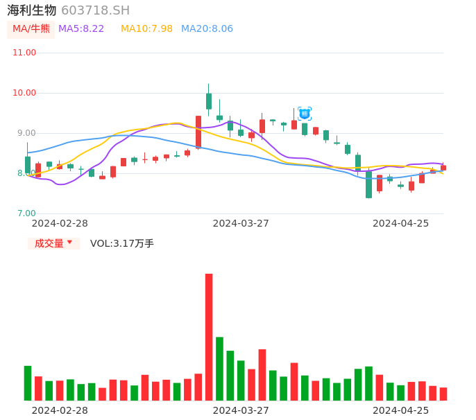 04月25日,海利生物收报8.19,股价涨幅1.36%,成交金额2596.61万元,换手率0.49%。