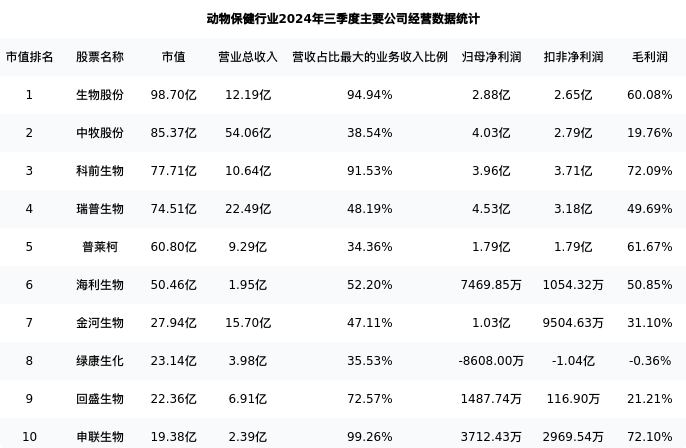 海利生物最新报告期数据为三季度,下表汇总了动物保健行业内市值靠前的公司三季度主要经营数据