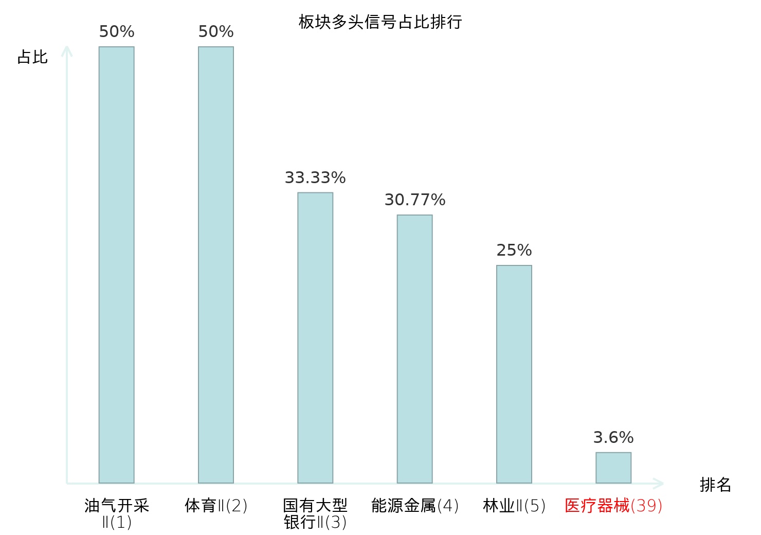 全市场所有行业板块中主力多头信号占比排名中,油气开采Ⅱ板块位居第一。体育Ⅱ板块名次提升最快,较昨日上升129位。