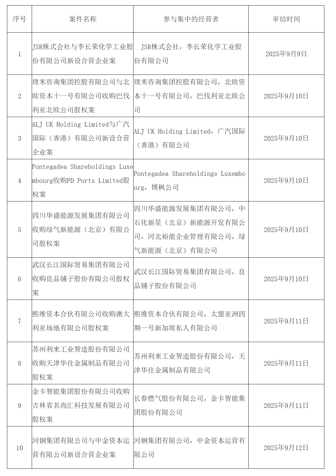 人民财讯9月23日电,市场监管总局发布2025年9月8日—9月14日无条件批准经营者集中案件列表,包括武汉长江国际贸易集团有限公司收购良品铺子股份有限公司股权案等。
