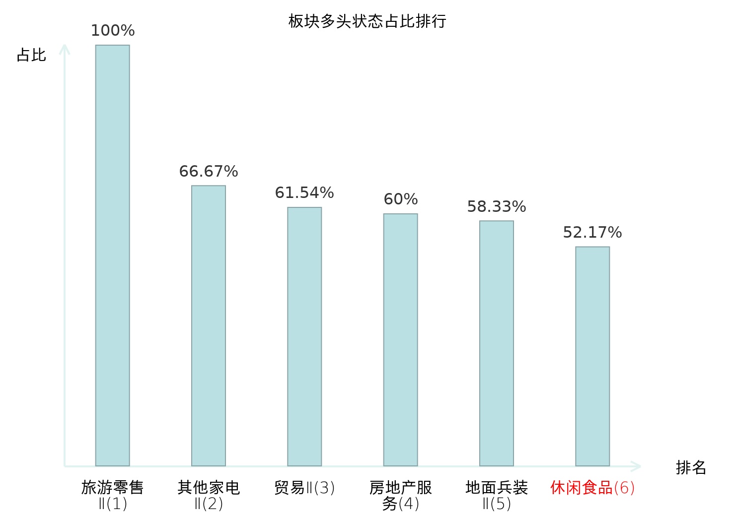 全市场所有行业板块中主力多头状态占比排名中,旅游零售Ⅱ板块位居第一。化妆品板块名次提升最快,较昨日上升62位。