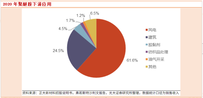 聚醚胺作为环氧树脂的高性能固化剂,用于生产高强度、高韧性的复合材料,尤其适用于碳纤维复合材料及大型玻璃纤维复合材料(兆瓦级风力发电叶片)的制造,目前已广泛应用于风力发电、纺织印染、铁路防腐、桥梁船舶防水、石油及页岩气开采等领域,聚醚胺制造业正处于快速发展阶段。