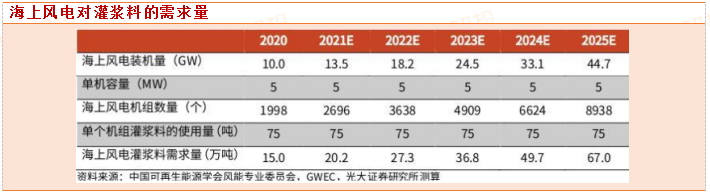 根据前述海上风电装机量的预测,预计2020年海上风电对灌浆料的需求量约为15万吨,2025年海上风电对灌浆料的需求量增至约67万吨,需求量大幅增加。
