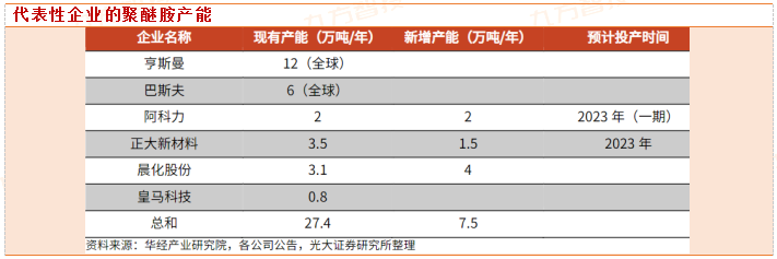 全球聚醚胺主要供应商为亨斯曼和巴斯夫,合计具有约18万吨产能。国内现有的聚醚胺生产厂家数量较少,行业集中度较高,根据现有产能规划,未来行业集中度有望进一步提高。