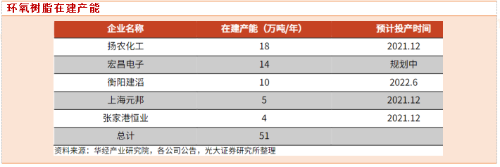 假设后续环氧树脂下游应用比例与2019年的各项比例一致,且下游复合材料领域中有60%用于风电叶片,我国2021年用于风电叶片的环氧树脂预计约26.4万吨。根据华经产业研究院不完全统计,目前国内环氧树脂在建产能约51万吨/年,扩产主要来自龙头企业,行业集中度有望进一步提高。