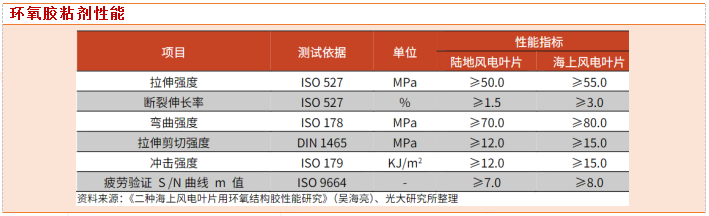 结构胶主要用于风电叶片上下壳体的粘接,是叶片结构的一个重要组成部分,也是叶片力学及结构失效的主要影响部位。风电叶片必须承载周期性负荷以及在运转中遭遇的极端天气,结构胶需要保证叶片长达20年的使用寿命内拥有持续且稳定的机械性能,且不会因为叶片在使用过程中的振动导致叶片开裂和脱落。与此同时,考虑到海上风电场环境恶劣,机组功率较大,其整体力学性能指标应高于通用性技术要求。