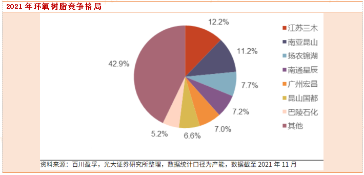 根据百川盈孚统计,截至2021年11月,我国2021年环氧树脂产能共计221万吨/年,且行业竞争格局较为分散。