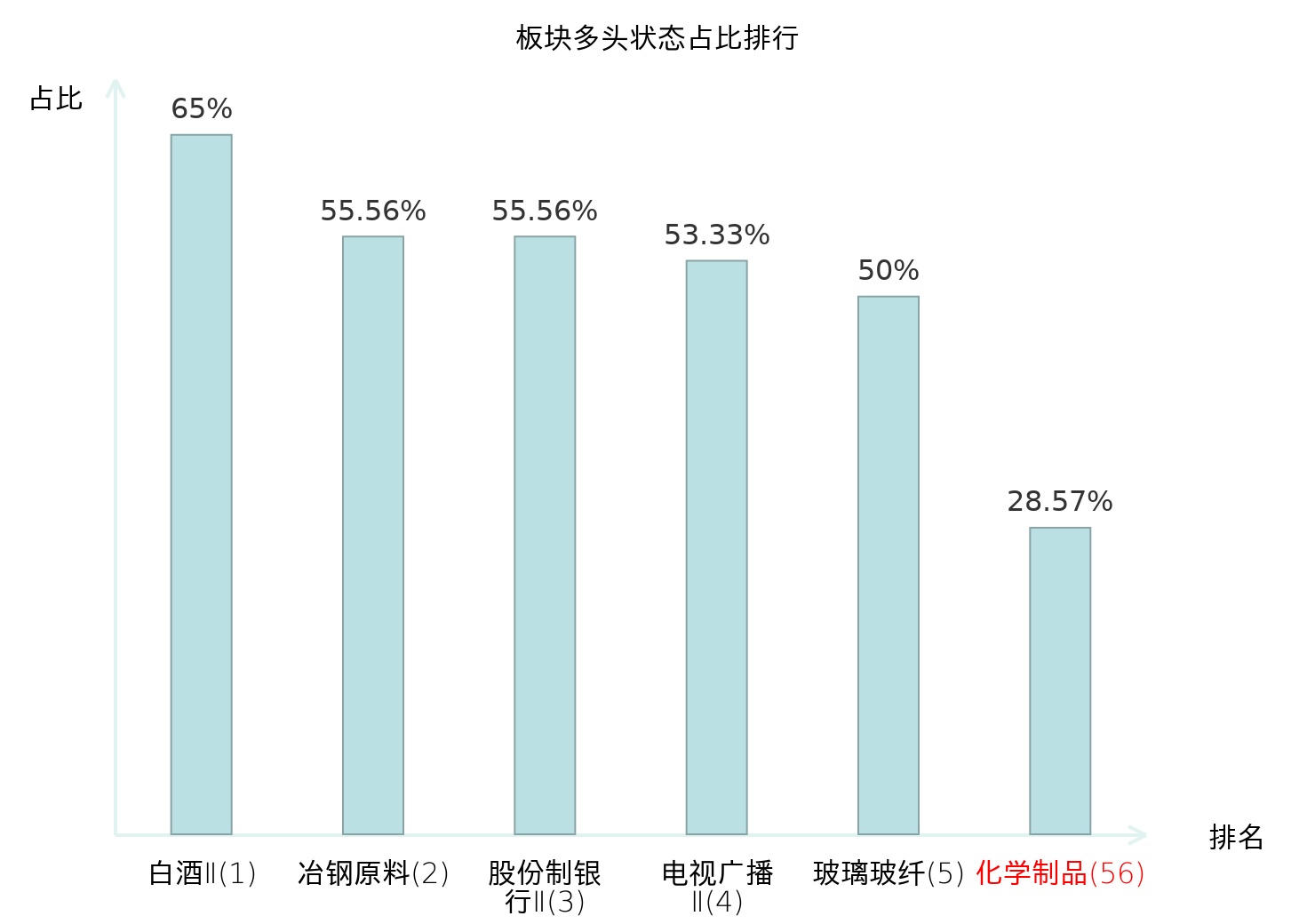 全市场所有行业板块中主力多头状态占比排名中,白酒Ⅱ板块位居第一。白酒Ⅱ板块名次提升最快,较昨日上升71位。