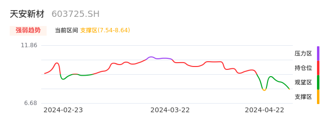 我们来看一下该股的九方特色指标强弱趋势的情况:天安新材近日从观望区进入支撑区。股价出现一波快速下跌行情,目前下跌动能仍未衰竭。建议继续谨慎观望。注意今日下方支撑位:7.54元,如有效跌破将可能出现新一轮下跌