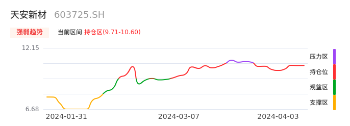 我们来看一下该股的九方特色指标强弱趋势的情况:天安新材自03月25日从压力区回到持仓区。股价在持仓区盘整一段时间后,目前有启稳迹象。后续重点关注上方压力位:10.60元是否能重新上攻。