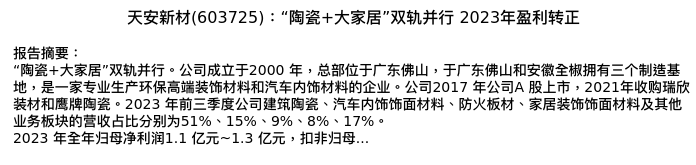 值得注意的是:2024年03月东北证券的濮阳/庄嘉骏分析师,首次发布关于天安新材的研究报告,标题为:天安新材(603725):“陶瓷+大家居”双轨并行 2023年盈利转正。