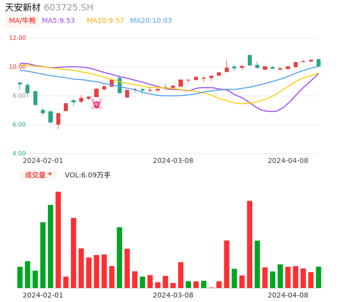 04月08日,天安新材收报10.03,股价涨幅-4.20%,成交金额6226.99万元,换手率2.97%。