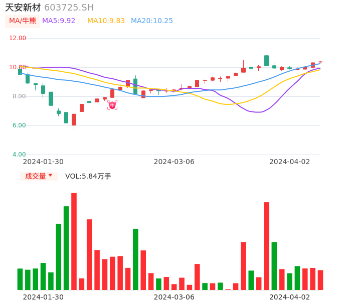 04月02日,天安新材收报10.38,股价涨幅0.68%,成交金额6050.79万元,换手率2.84%。