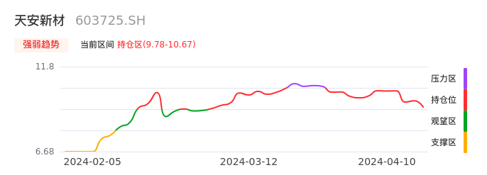 我们来看一下该股的九方特色指标强弱趋势的情况:天安新材自03月25日从压力区回到持仓区。股价近期持续调整。后续重点关注能否站稳多空分界点:9.78元。如被有效击穿则将进入空头行情。