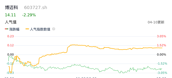 04月10日,博迈科收报14.11,股价涨幅-2.29%,成交金额8449.13万元,换手率2.12%。