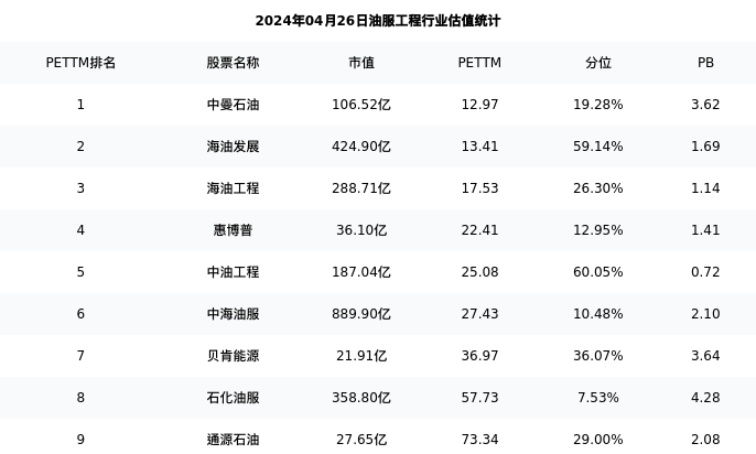 博迈科最新报告期数据为一季度,下表汇总了油服工程行业内市值靠前的公司一季度主要经营数据