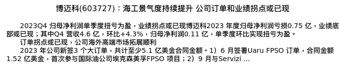 值得注意的是:2024年04月天风证券的张樨樨/朱晔分析师,首次发布关于博迈科的研究报告,标题为:博迈科(603727):海工景气度持续提升 公司订单和业绩拐点或已现。