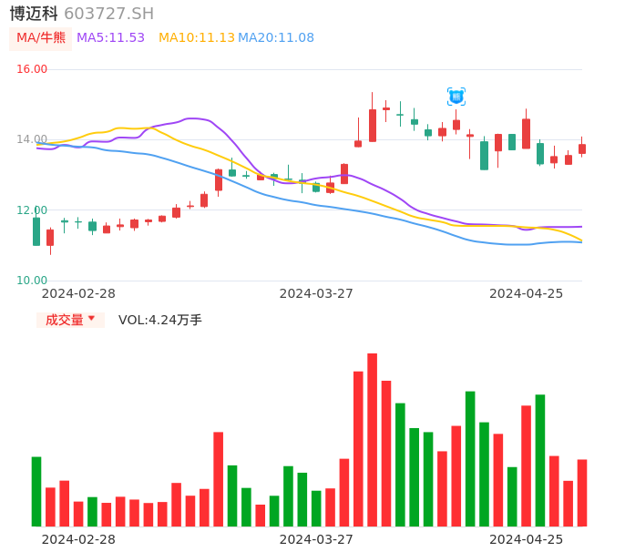 04月25日,博迈科收报13.86,股价涨幅2.29%,成交金额5875.18万元,换手率1.51%。