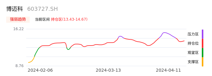 我们来看一下该股的九方特色指标强弱趋势的情况:博迈科近日从压力区回到持仓区。股价快速拉升后出现持续调整,目前出现启稳回暖态势。后续重点关注上方压力位:14.67元是否能再次上攻。