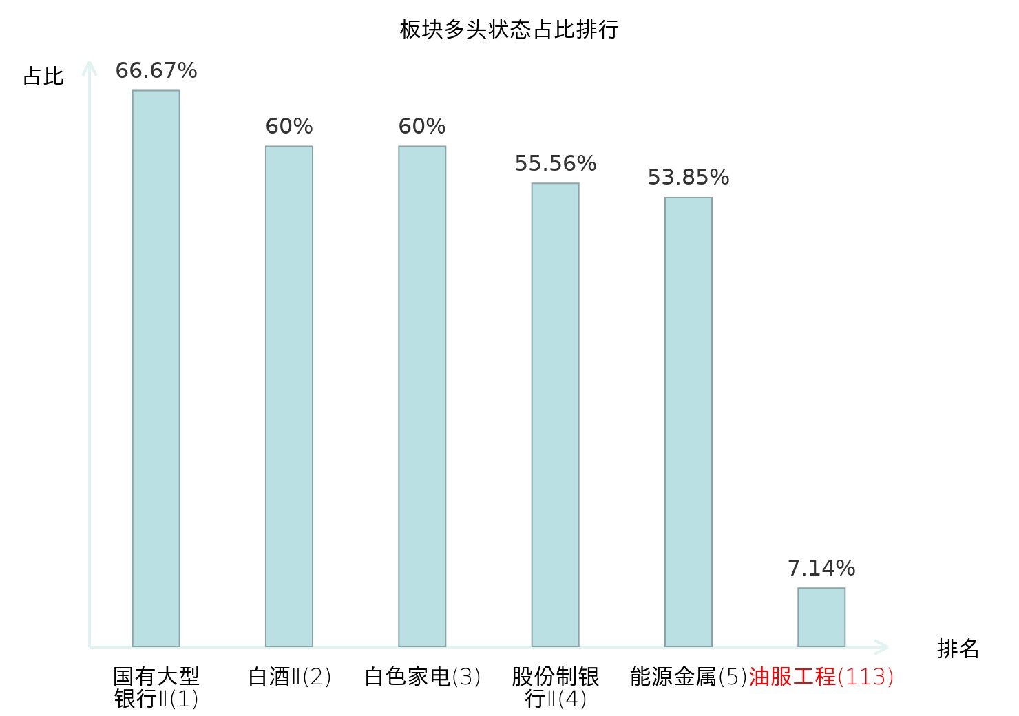 全市场所有行业板块中主力多头状态占比排名中,国有大型银行Ⅱ板块位居第一。电子化学品Ⅱ板块名次提升最快,较昨日上升55位。
