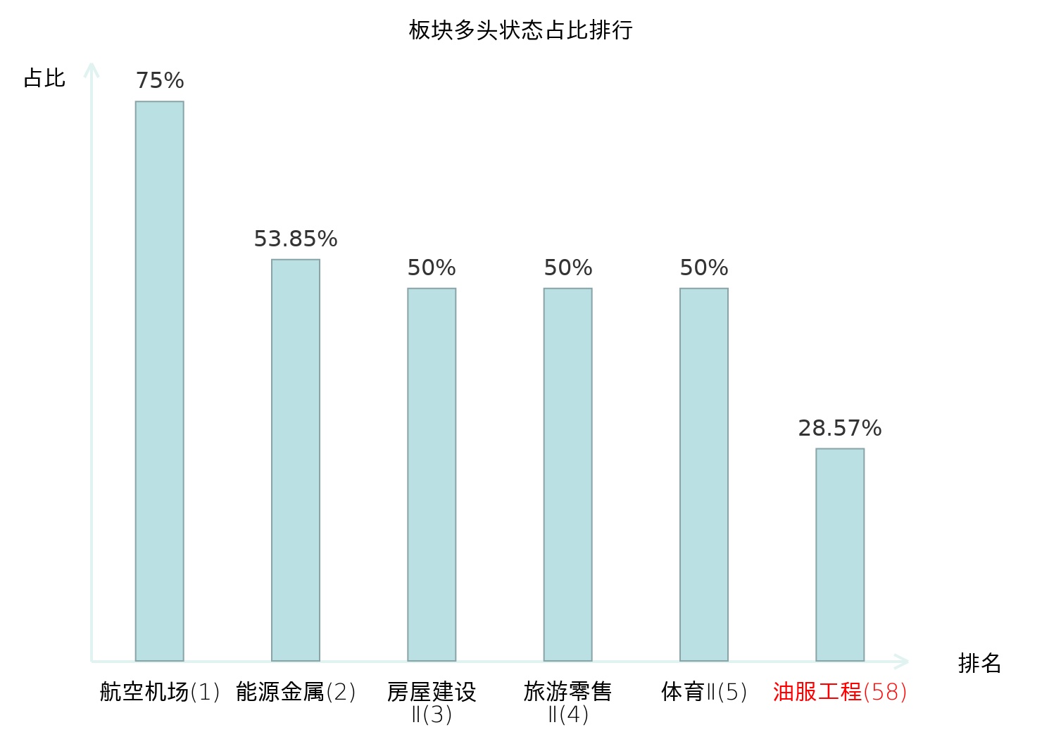 全市场所有行业板块中主力多头状态占比排名中,航空机场板块位居第一。其他电子Ⅱ板块名次提升最快,较昨日上升53位。