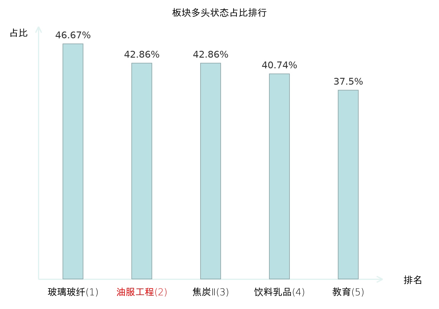 全市场所有行业板块中主力多头状态占比排名中,玻璃玻纤板块位居第一。航空机场板块名次提升最快,较昨日上升43位。
