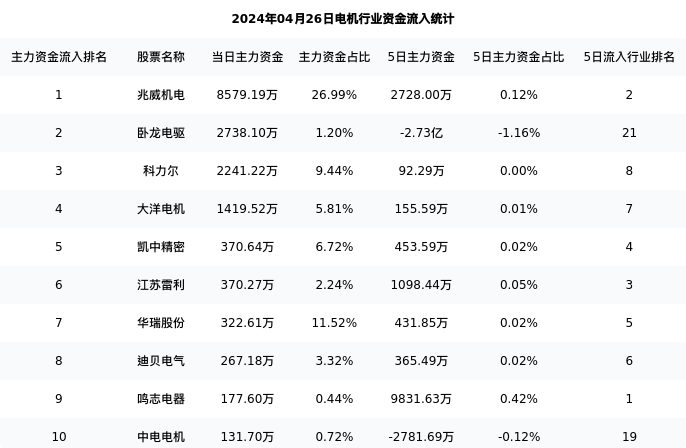 从主力资金流向来看,电机行业今日主力资金流入16.08亿元,在所有申万二级行业中排名:115/131。